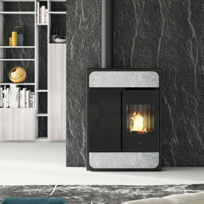 Pelletkachel met elegante lijnen met keramiek in zachte kleuren